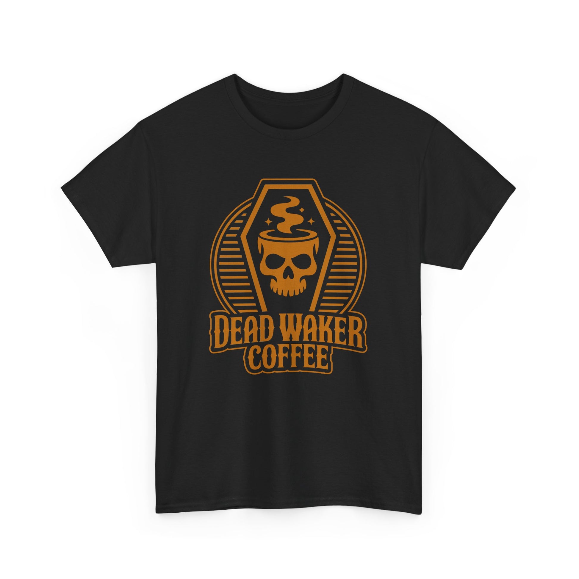 Bring the dark roast to life with the Dead Waker Coffee Coffin Skull Tee. This black graphic shirt features our official Dead Waker Coffee logo, a steaming skull mug resting inside a coffin-shaped design, making it the ultimate statement piece for coffee lovers who live loud, caffeinated, and unafraid.
